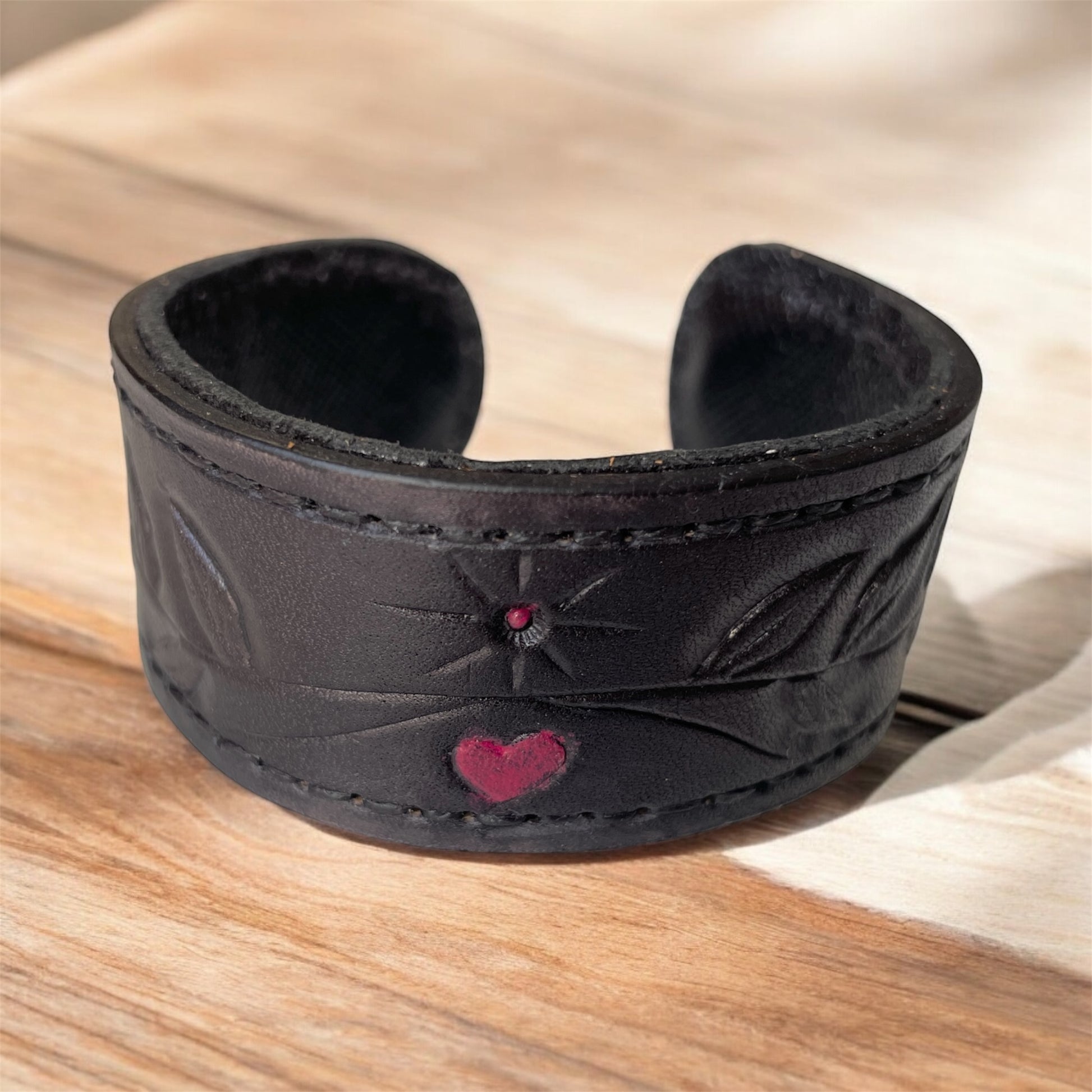 Découvrez cette manchette en cuir de tannage végétal, soigneusement teintée, peinte et cousue à la main. Chaque pièce unique affirme votre style avec caractère, alliant artisanat traditionnel et design provocant pour sublimer votre allure. Osez l’originalité et laissez parler votre audace. Elle est réglable.