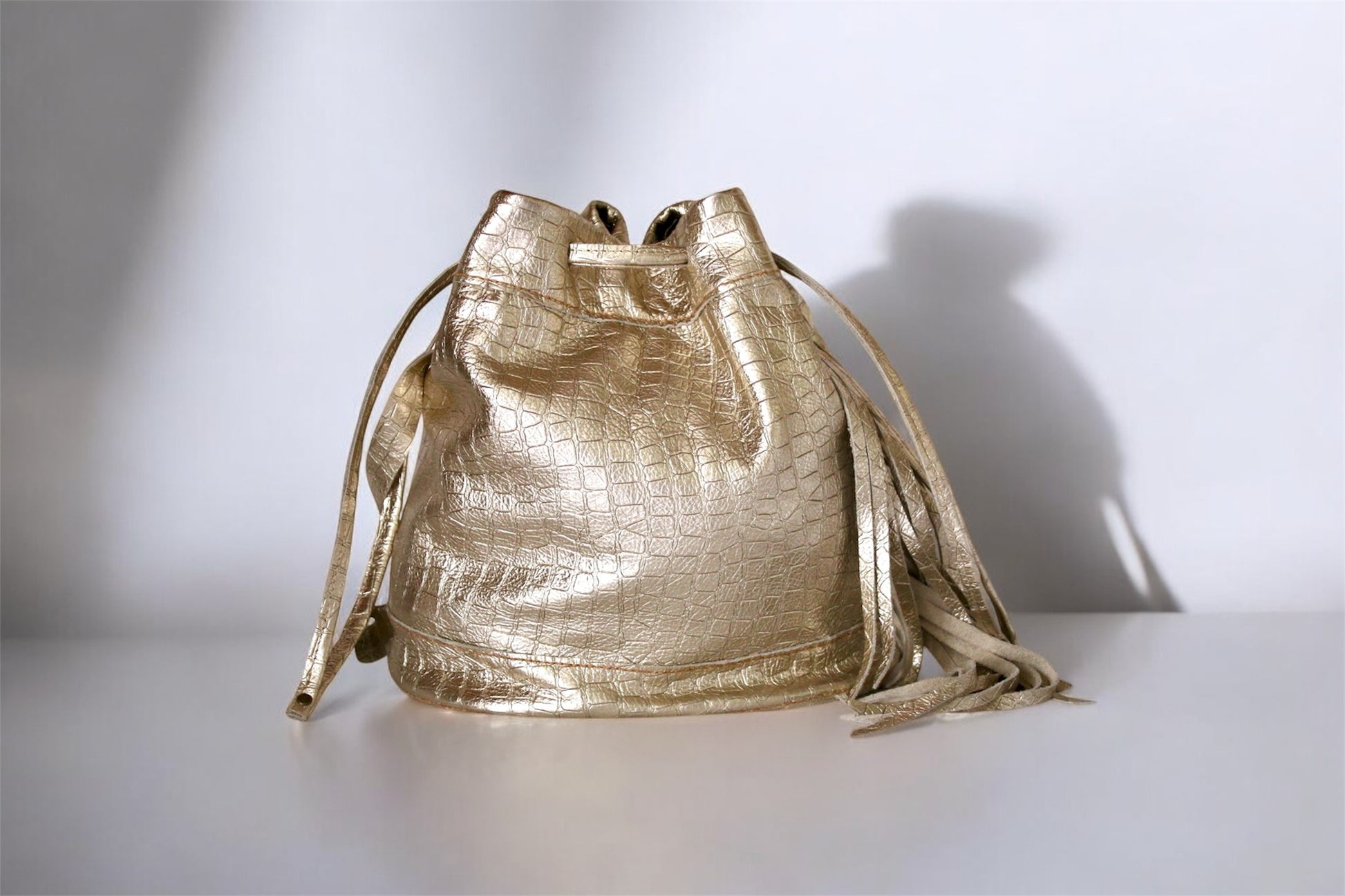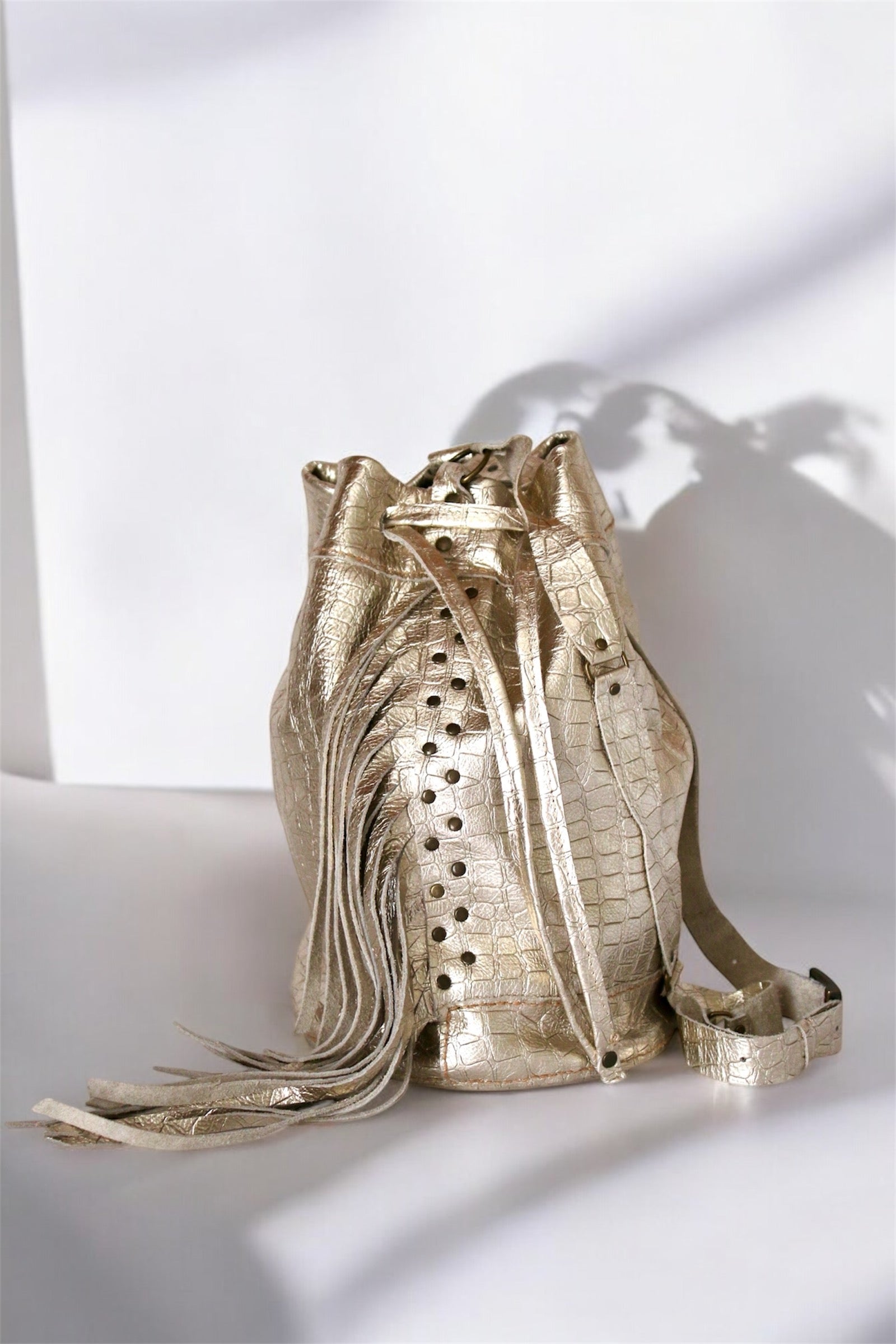 Gardez un look audacieux avec notre sac en cuir et à franges ! Fabriqué en cuir pleine fleur, il mesure L16cmXl26cmXH27 et se décline en Or. Fermez-le en liens, puis découvrez sa doublure en coton enduit et sa bandoulière réglable (de 85cm à 120cm). Pour un entretien optimal, vaporisez-le avec une bombe imperméabilisante. Avec son style bohème/western, sa qualité de cuir et sa fabrication artisanale, c'est un modèle unique à ne pas manquer !