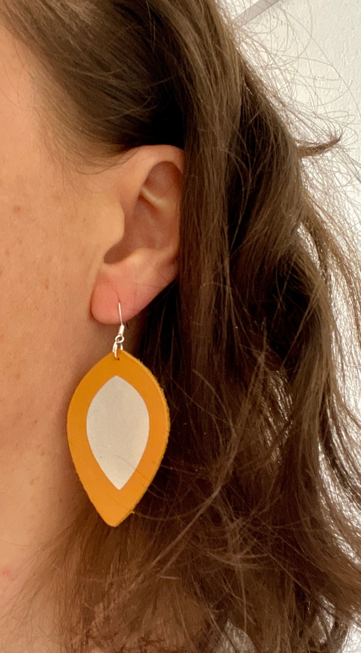 Découvrez les boucles d'oreilles en feuilles faites à la main en cuir de qualité supérieure, suspendues à des crochets en argent 925. Fournies avec des stoppeurs en silicone pour éviter les pertes, elles ajoutent une touche de fantaisie à votre look avec leur design original et leurs dimensions de 3cmx5cm. Elles sont parfaitement légères pour un confort tout au long de la journée.